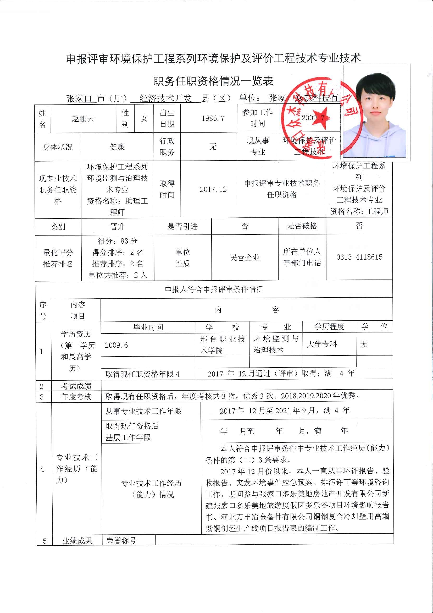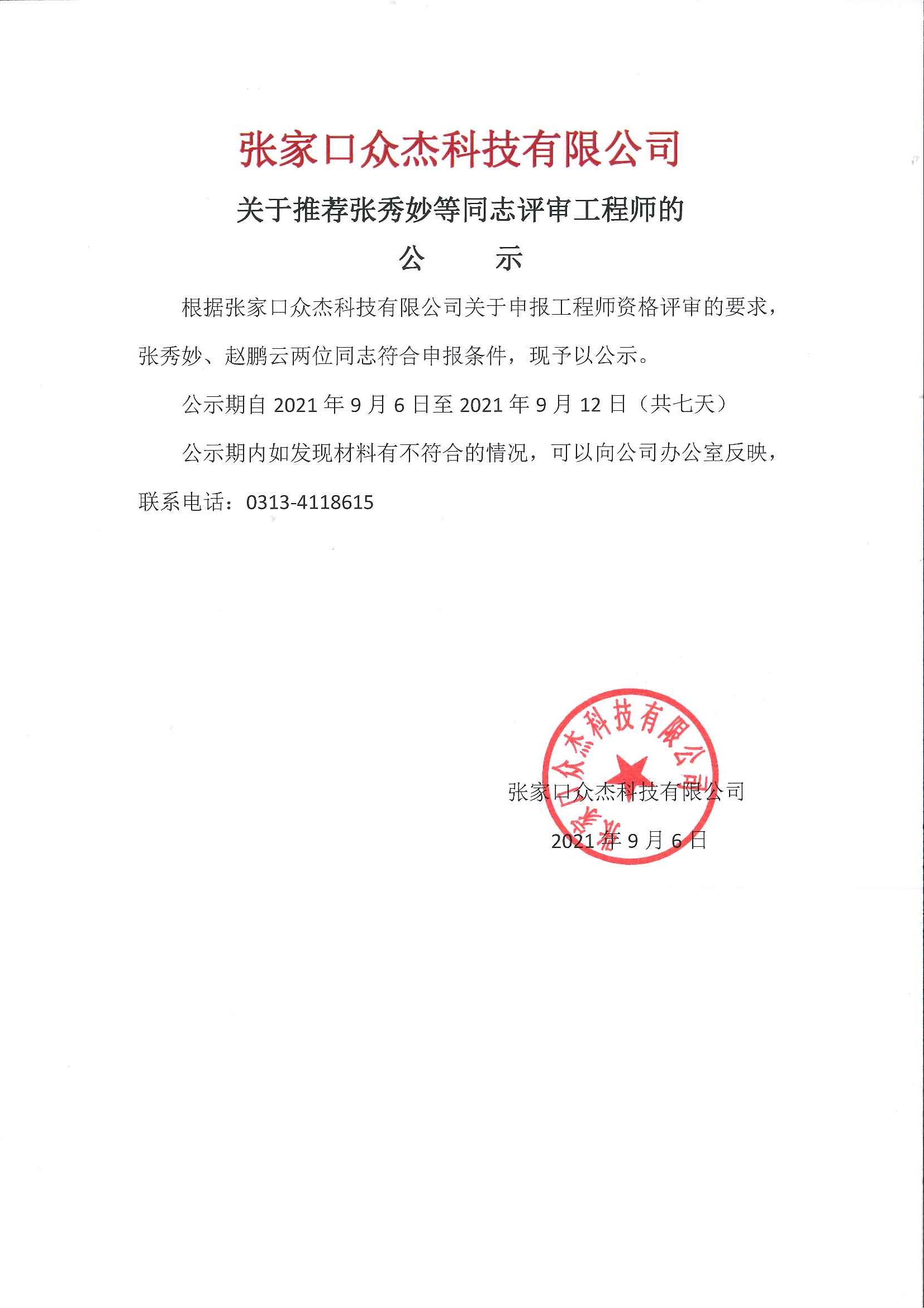 根據(jù)張家口眾杰科技有限公司關(guān)于申報(bào)工程師資格評(píng)審的要求,張秀妙、趙鵬云兩位同志符合申報(bào)條件,現(xiàn)予以公示。